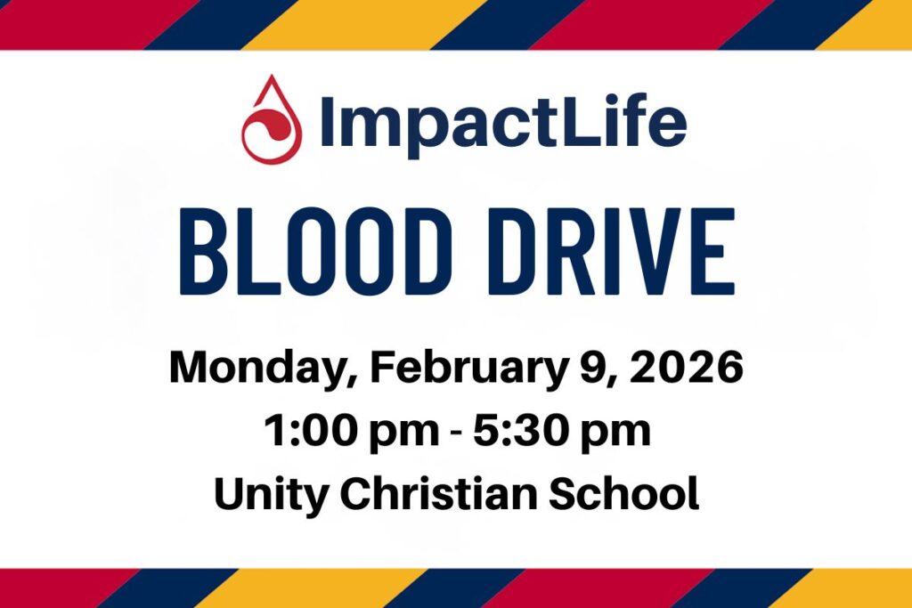 Monday, February 9th: Impact Life Blood Drive Help save lives by donating from 1:00 PM – 5:30 PM at Unity Christian School. Every donation directly impacts lives in our community. You can schedule your appointment online or visit the Impact Life website for more details.